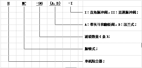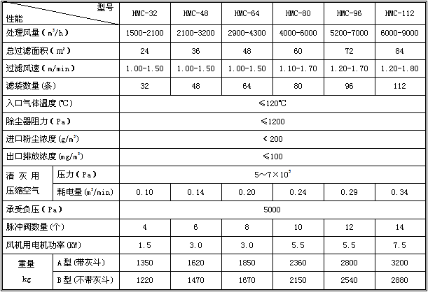 HMC型除尘器的进风口设在灰斗上,当含尘气体从进风口进入灰斗后首先碰上进风管端部的挡板,由于惯性作用,使气体中粗颗粒粉尘直接进入灰斗,起到预收尘的作用。进入灰斗的气流随后折而向上通过内部装有金属骨架的滤袋,粉尘被收集在滤袋的外表面,净化后的气体进入滤袋室上部的清洁室,汇集到出风管排出。室内收尘袋分为若干排,按照给定的时间间隔对每排收尘袋进行清灰。当脉冲阀开启时,即向滤袋内喷入高压空气,以清除滤袋表面上的粉尘。各排滤袋的脉冲喷吹宽度和清灰周期,由专用的清灰程序控制器自动连续控制。除尘器的构造和工作原理参见附图。